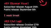 - May 12, 2023 by atrX2#v0.3, #v0.4, #v0.5, #announcement, #adult, #anime, #comedy, #dating-sim, #erotic, #nsfw, #psychological, #romance, #schoolHi there! Now that v0.2 is officially out for $5+ subscribers we look to the future, and I don't just mean v0.3... Based on the last few weeks, or even months of development I've decided to move to a... Continue reading